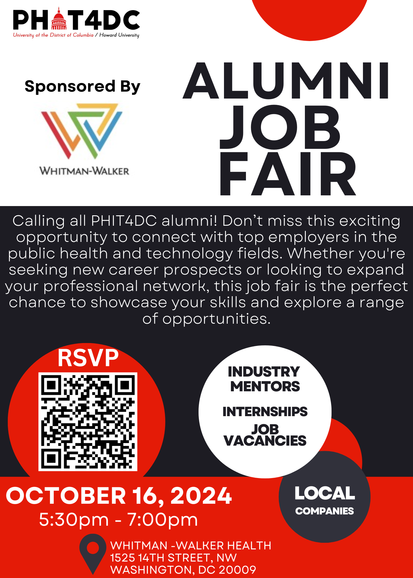 Calling all PHIT4DC alumni! Don’t miss this exciting opportunity to connect with top employers in the public health and technology fields. Whether you’re seeking new career prospects or looking to expand your professional network, this job fair is the perfect chance to showcase your skills and explore a range of opportunities.