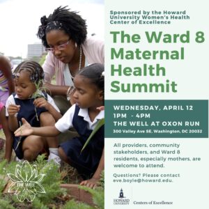 April 12, 2023, 1:00 pm – The Ward 8 Maternal Health Summit will focus on improving the overall health of women, babies and families by connecting elected officials, health and education experts, community-based partners in Ward 8. In preparation for the Cedar Hill Regional Medical Center bringing a maternity ward East of the River, we are working to identify current resources and fill any gaps in the community’s perinatal health and birth landscape. This event is open to the public and is a Ward 8 specific precursor to the National Maternal and Infant Health Summit and will take place at The Well at Oxon Run, 300 Valley Ave SE.