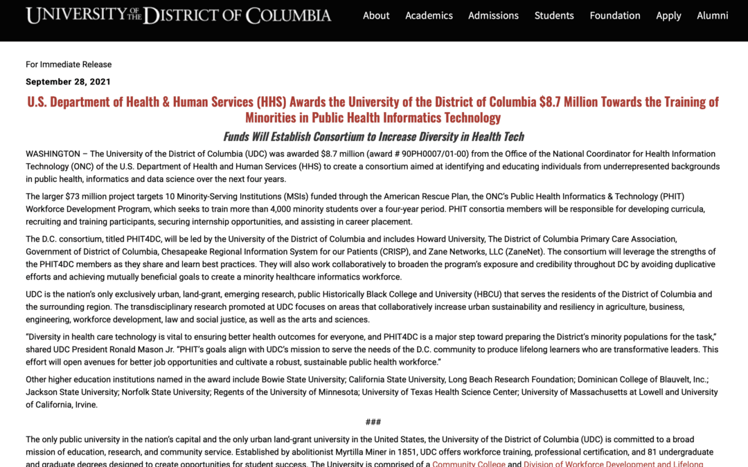 U.S. Department of Health & Human Services (HHS) Awards the University of the District of Columbia $8.7 Million Towards the Training of Minorities in Public Health Informatics Technology Funds Will Establish Consortium to Increase Diversity in Health Tech...