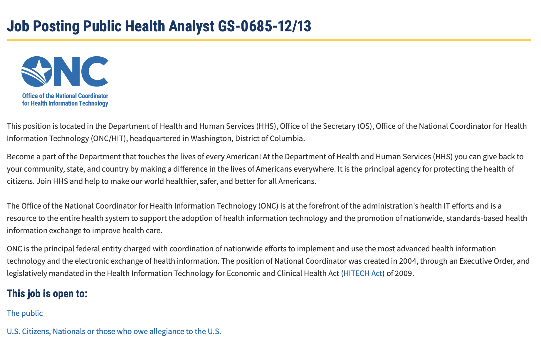 The Public Health Analyst, GS-0685-12/13 (Schedule A COVID 19) announcement is now posted on ONC Careers webpage for you to share with eligible candidates. The Public Notice Link provided below will take applicants directly to the job posting and provide specific information concerning the position and application procedures. Since this announcement (public notice) is not posted on USAJOBS, the applicants are instructed to submit their documents to the HCB mailbox. The resumes will be saved in the Shared Certificate folder Schedule A COVID 19 Resumes every Thursday for your review.