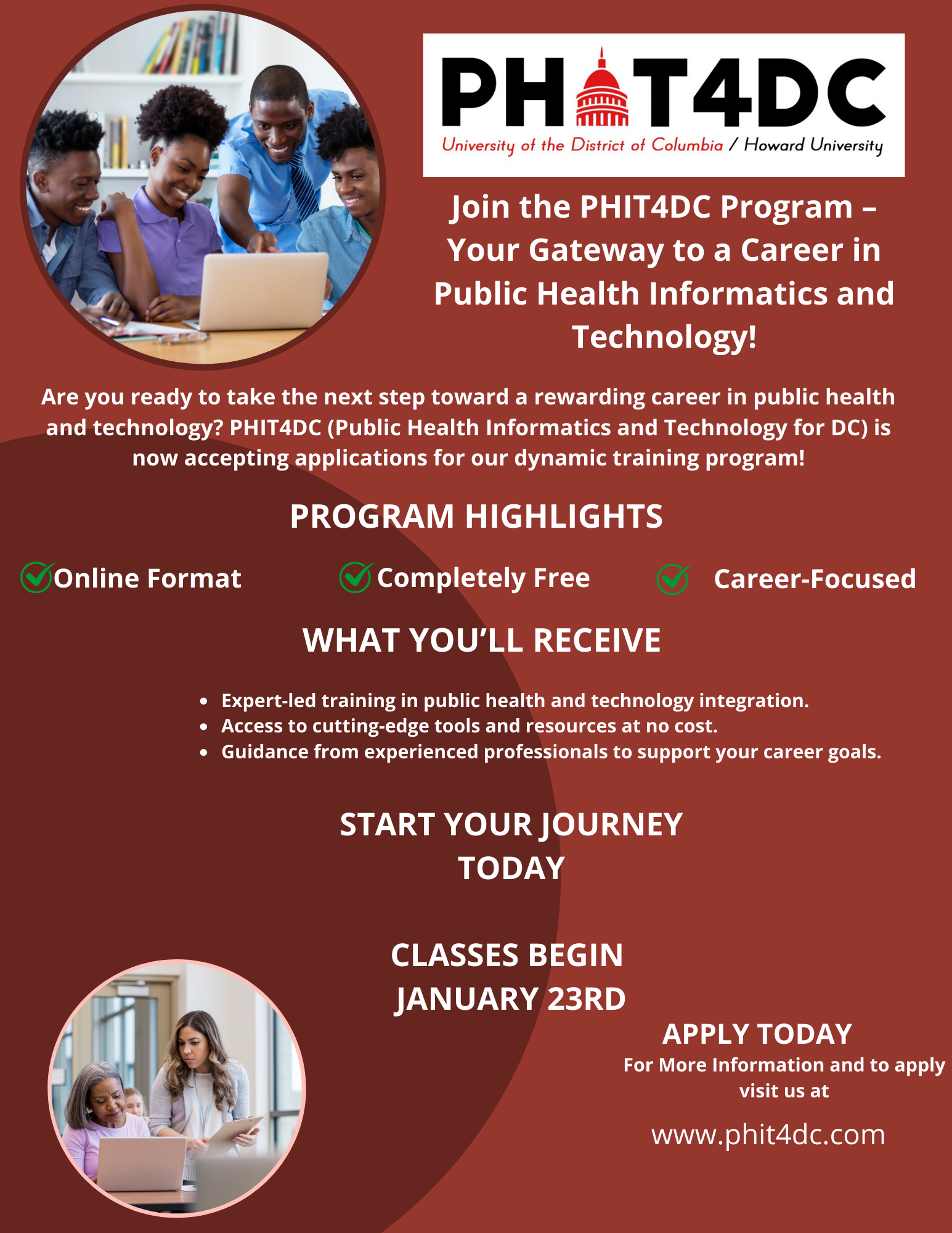 Are you ready to take the next step toward a rewarding career in public health and technology? PHIT4DC (Public Health Informatics and Technology for DC) is now accepting applications for our dynamic training program!